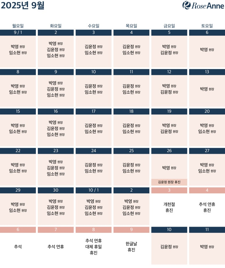 로즈앤은 10.3.(금)~10.9.(목) 연속 휴진합니다.