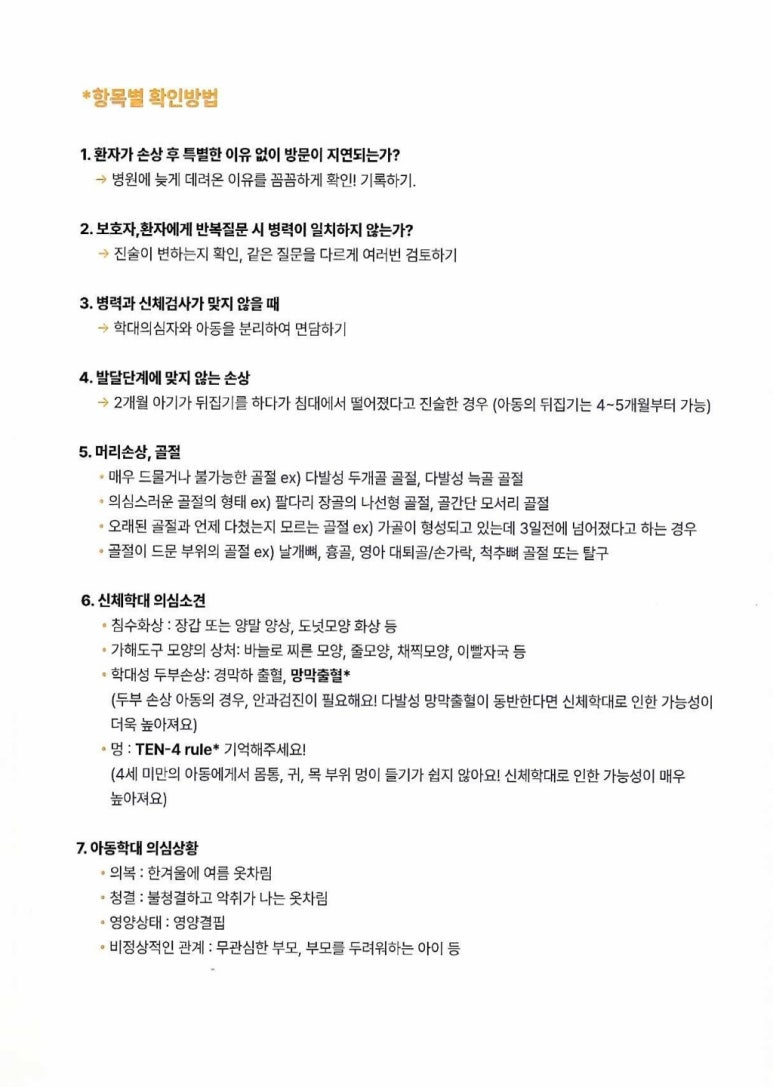 • 골절이 드문 부위의 골절 ex) 날개뼈, 금, 영아 대퇴골/손가락, 척추뼈 골절 또는 탈구