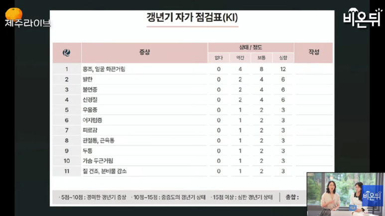 혹시 갱년기가 의심되는 분들은 이번 방송을 재시청하면서 <갱년기 자가 점검표>로 진단해보세요. 제주산부인과 로즈앤의원에서 의학적인 근거를 토대로 꼼꼼히 만든 자료입니다.