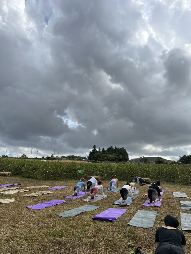 이렇게 야외에서 누구나 펼쳐진 매트위에서 요가를 할 수도 있었어요. 제주 라이프의 낭만이 이 사진 한 장에 다 담겨있네요. 다음에는 저도 꼭 참여해보고 싶습니다.