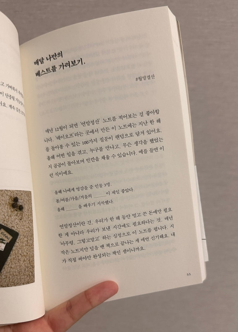 나아가 매년 12월, 연말에는 가장 좋았던 베스트를 뽑습니다. 매월 마지막 날 저녁을 '연말결산의 날'로 정하는 것이 좋다는 귀여운 꿀팁도 함께 적혀 있네요- 휴대폰 캘린더에 반복 알림 설정을 해두면 더 좋겠고요.