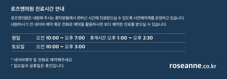 로즈앤의원은 고객의 시간을 아껴드리기 위해 사전예약제를 운영합니다. 네이버 예약 혹은 전화 예약을 통해 쾌적하고 편리하게 진료받을 수 있습니다.